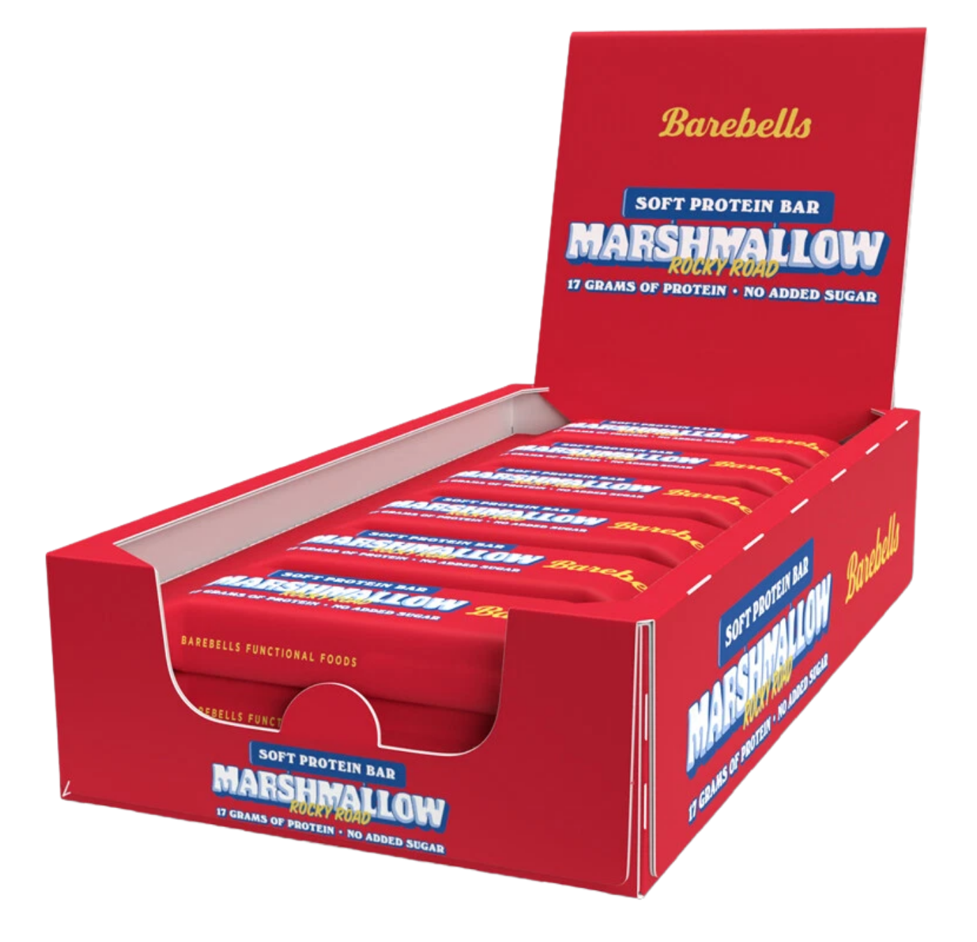 Barebells Soft Protein Bar Marshmallow Rocky Road – Soft Protein Bar mit 17 g Protein pro Riegel. Gefüllt mit weichen Marshmallow-Puffs, knackigen Erdnüssen und einer cremigen Karamellsoße, umhüllt von einer Schicht Milchschokolade. Mit Süßungsmitteln. Kann bei übermäßigem Verzehr abführend wirken. 12 Riegel à 55 g (660 g).