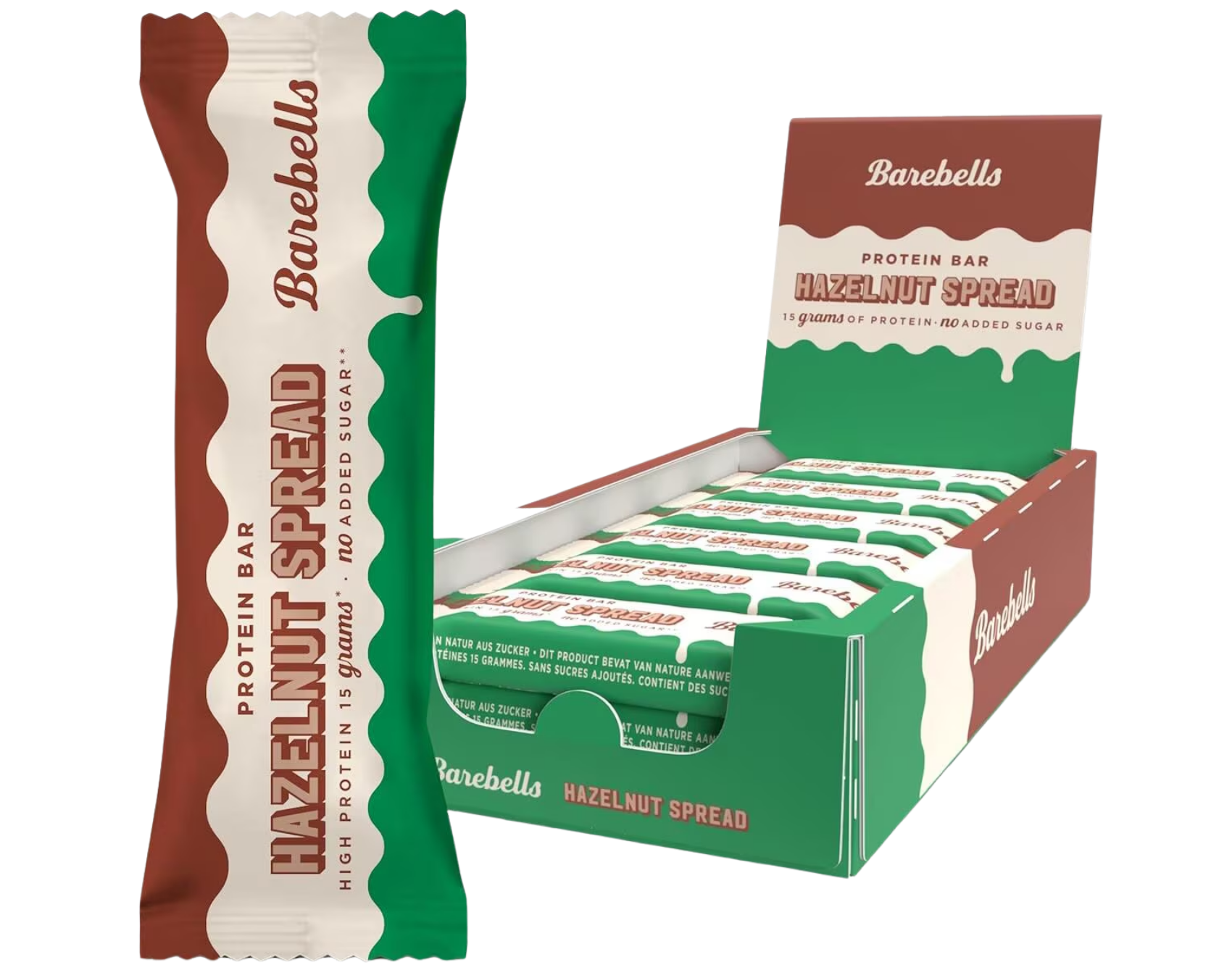 Barebells Spread Protein Bar Chocolate Spread – Protein Bar mit 15 g Protein pro Riegel (45 g) und ohne Zuckerzusatz (enthält von Natur aus Zucker). Ein unglaublich softer, cremiger Schokoladenkern, umhüllt von zartschmelzender Schokolade. Mit Süßungsmitteln. 12 Riegel à 45 g (540 g). Barebells Spread Protein Bar Hazelnut Spread – Protein Bar mit 15 g Protein pro Riegel (45 g) und ohne Zuckerzusatz (enthält von Natur aus Zucker). Besonders weicher, cremiger Kern mit intensivem Haselnuss-Kakao-Geschmack. Mit Süßungsmitteln. Ohne Palmöl. 12 Riegel à 45 g (540 g). Milcheiweiß, Polydextrose, Süßungsmittel (Maltit), Feuchthaltemittel (Glycerin), Kollagen-Hydrolysat, Kakaobutter, Vollmilchpulver, Sojaprotein, Wasser, Kakaomasse, Sonnenblumenöl, fettarmer Kakaopulver, Kakaopulver, Tapiokastärke, Aromen, Salz, Kakaoextrakt, Emulgator (Lecithine), Süßungsmittel (Sucralose). Allergene: Enthält Milch, Soja. Kann Spuren von Schalenfrüchten, Erdnüssen und glutenhaltigem Getreide enthalten. Milcheiweiß, Polydextrose, Kollagen-Hydrolysat, Feuchthaltemittel (Glycerin), Süßungsmittel (Maltit), Kakaobutter, Vollmilchpulver, Wasser, Kakaomasse, Haselnüsse (geröstet), Haselnusspaste, Sonnenblumenöl, Sojaprotein, Aromen, fettarmer Kakao, Salz, Emulgator (Lecithine), Süßungsmittel (Sucralose). Allergene: Enthält Milch, Soja, Haselnüsse (Schalenfrüchte). Kann Spuren von weiteren Schalenfrüchten, Erdnüssen und glutenhaltigem Getreide enthalten.| Nährwert | pro 100 g | pro Riegel (45 g) |